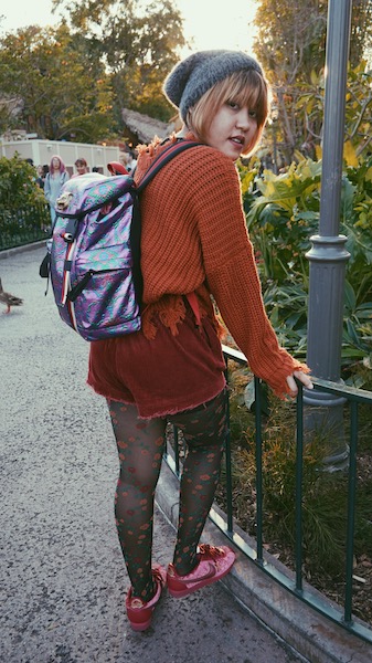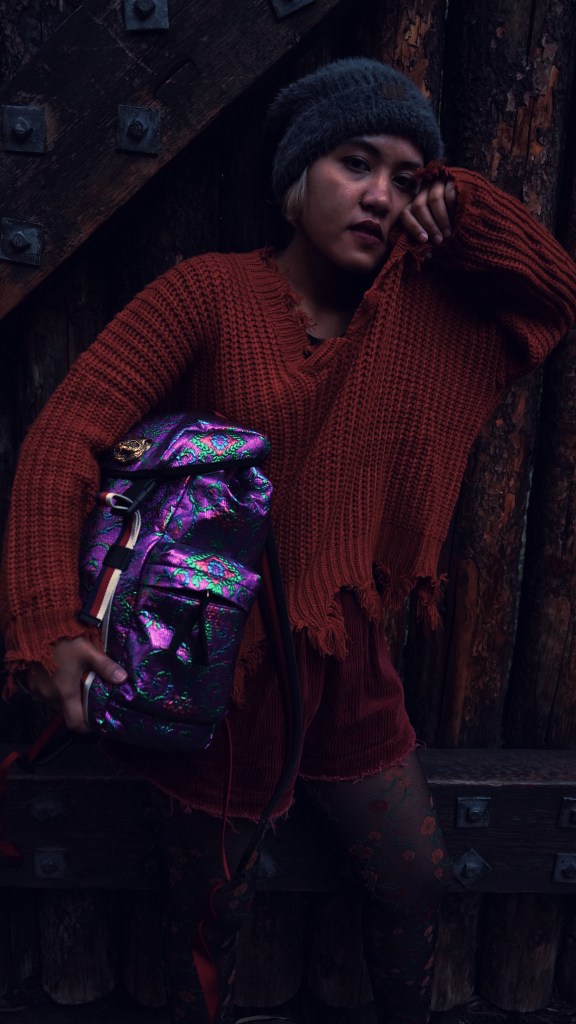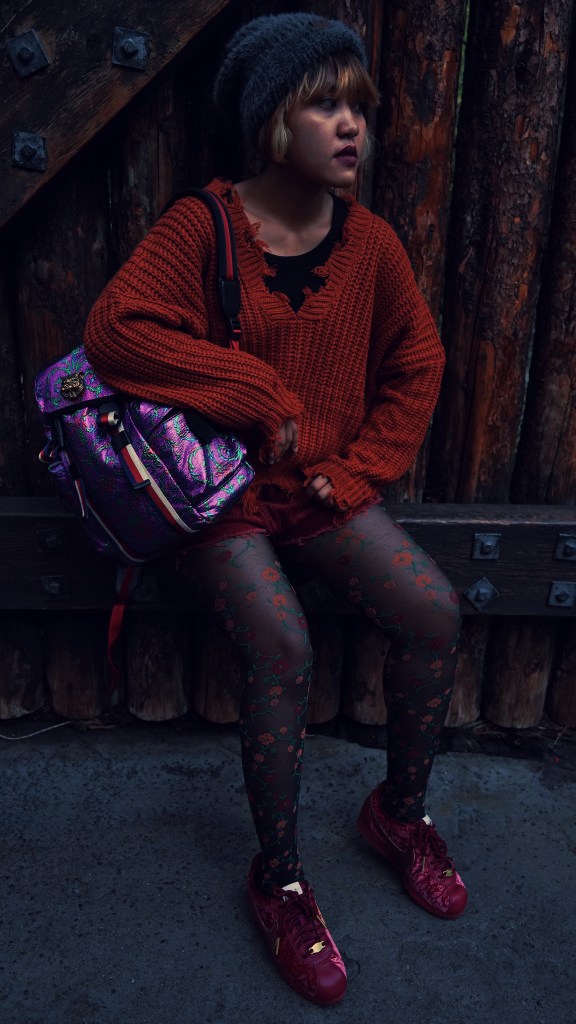 I paired it up with loose short pants to give the body enough room to move. For the shoes, I chose bowling sneaker from Nike since it is nice to wear for a long distance walk. Next, I decided to wear a flowery stocking to make the look more playful. I put on a fluffy-greyish hat cap to balance the warm color (orange, red, and pink) I wore and to make me feel warm and cozy.