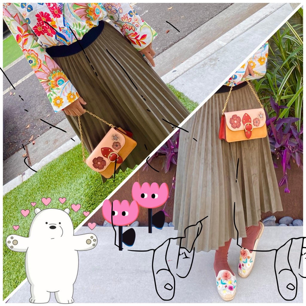Once I open her wardrobe, my eye was caught directly into the muddy green pleat skirt that my sister had. Because the color of the skirt kind of dark, I wanted to make the look shines bright like a rainbow. To achieve that, I wore colourful flowery T shirt.