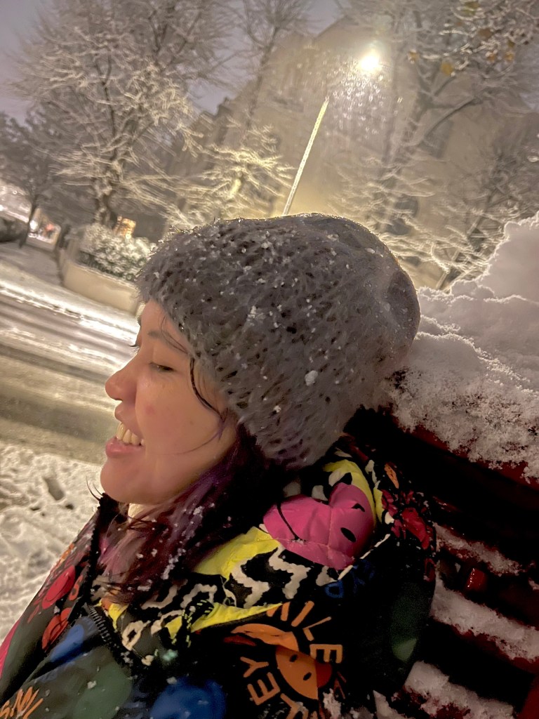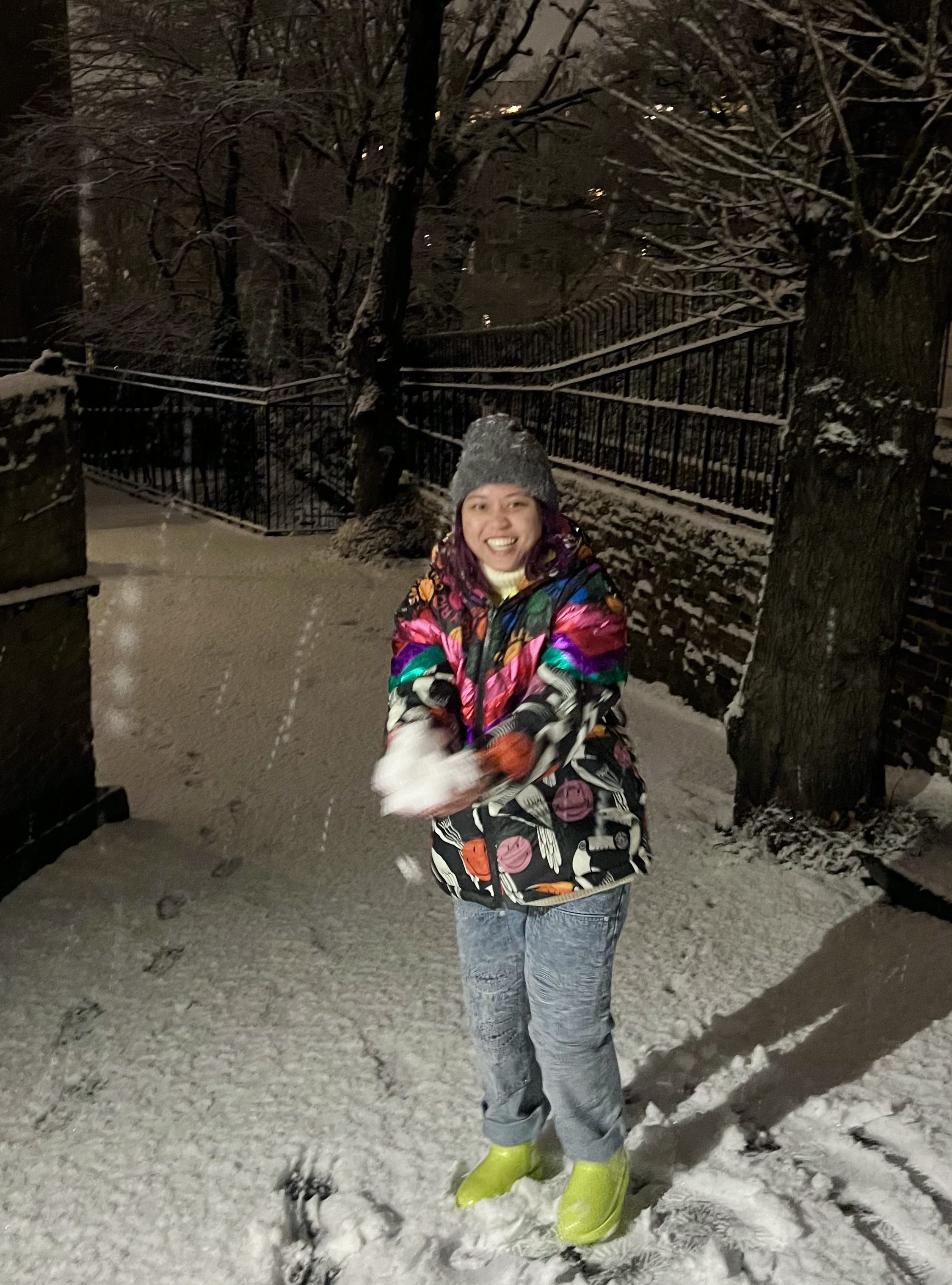 My sister, Ghina, wore her R13 denim jacket while throwing balls of snow at me